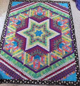 Last week I went to Pierre for an eye appointment, the pressure in my eyes is good, then met a friend for lunch we caught up on each others lives and how we were quilting from our stashes and only buying fabric if we needed it to finish a quilt. I had this quilt top in the car its just kinda awkward to show a quilt in a restaurant even though the lunch crowd had long gone by the time we were done. So we went to the quilt shop to unfold my quilt, I needed some turquoise for the corners, its not a match to the diamonds or center triangles but it pulls the quilt together. I bought the turquoise and the polka dots for binding since all my black and whites were fat quarters then we both broke our rule and bought more fabric just because it was there.