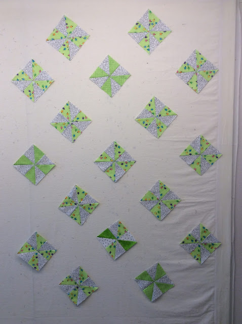 I walk downstairs and see this on the design wall its like a cool tropical breeze coming off the water. These colors and fabrics are so bright and refreshing. All of these parts were leftovers from previous kaleidoscope block quilts. Sometimes I really get carried away cutting strips and segments for quilts. The only fabric that had fresh cuts was the border fabric and all of it was in the stash. I'll make a couple more quilt tops before I baste and machine quilt. --Ann--